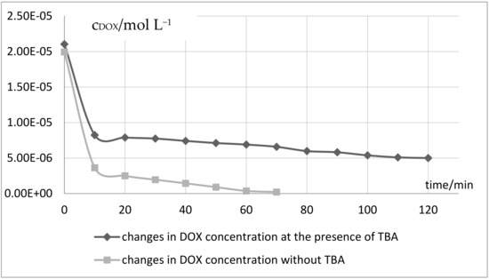 Figure 3. Changes in DOX concentration under influence of Vis-Fe(III)-sulphite system in presence and without TBA.