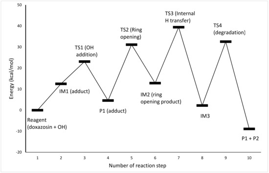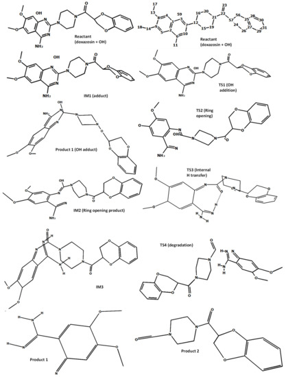 In order to gain a deeper understanding of the initial stages of the process of molecular degradation of doxazosin, a quantitative DFT mechanistic study was carried out. The calculations were performed with the GAUSSIAN 09 program [40]. To accurately capture properties of the transition states, a DFT functional M06-2X [41], designed especially for the chemical kinetics, was utilized in combination with a Dunning’s correlation consistent basis set cc-pVDZ. This theory level is sufficient to capture the physical change along the reaction coordinate for processes investigated here. To model the solvent (water) effect, the CPCM approach was used [42], as implemented in the G09 program. The reaction course is outlined in Figure 4, and all the species involved are pictured in Figure 5. As seen from Figure 4, the reaction is initialized by the addition of the –OH group to the aromatic carbon (atom 7). It is well known that such processes go through short-lived intermediate (thermodynamically controlled step) and transition states (kinetic control) to form an adduct vulnerable to further degradation. It starts with breaking the bond between the addition center and neighboring nitrogen (N10), which is followed by the internal H transfer to form an intermediate (IM3) with keto and amino groups on the bond breaking sites (atoms C7 and N10). The actual destruction of the molecular structure occurs via breaking bond between N3 and C7. Recently, a scheme of the DOX decomposition based on the B3LYP results was proposed [43]. The favorable pathway takes place by cracking bonds N12-C15 and N12-C16. We tried to reproduce this scheme; however, at the M06-2X/cc-pVDZ theory level, no proper transition states leading to ring degradation were found despite many attempts. Nevertheless, since the molecule break-up proposed here starts at the closest vicinity of the bonds N12-C15 and N12-C16 (see Figure 5), our results led to the products with similar molecular masses as those proposed in [43]. As such, their experimental analysis supports both proposed pathways.