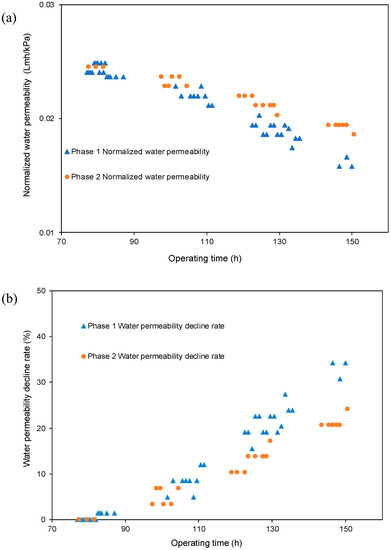 The normalized water permeability (NWP, liter per m2 per h per kPa, Lmh/kPa) corrected to 25 °C is calculated based on Equation (3) [39].