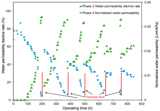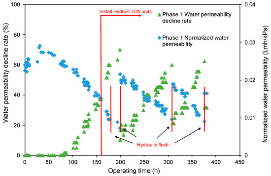 - The decreasing rate of the normalized water permeability (k value) with the HydroFLOW units during Phase 2 (P2) testing improved by 38.3% and 14.3% as compared to the permeate flux in Phase 1 (P1) testing in the 150 h (without HydroFLOW) and 370 h operation, respectively. After 700 h operation and 4 hydraulic flushes, the k value of P2 remained the same as the first 150 h operation, indicating less fouling and that the membrane performance had been improved in P2 by the installation of the EMF devices. The k value also shows less hydraulic flush was required with the EMF devices, which reduces the cleaning downtime. However, the NWP declined continuously despite the installation of HydroFLOW units. This infers the EMF could alleviate the fouling to a certain level but was not able to completely prevent it in the accelerated fouling process.