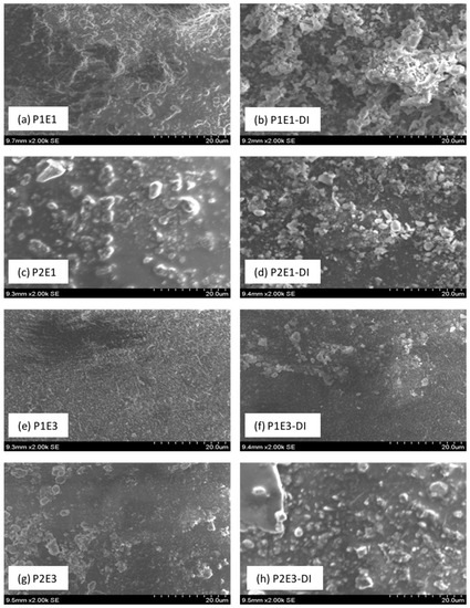 Scanning electron micrographs (SEM) of RO membranes. (a), Phase 1 Element 1 (P1E1); (b), Phase 1 Element 1, DI water rinsed (P1E1-DI); (c), Phase 2 Element 1 (P2E1); (d), Phase 2 Element 1, DI water rinsed (P2E1-DI); (e), Phase 1 Element 1 (P1E3); (f), Phase 1 Element 3, DI water rinsed (P1E3-DI); (g), Phase 2 Element 3 (P2E3); (h), Phase 2 Element 3, DI water rinsed (P2E3-DI).