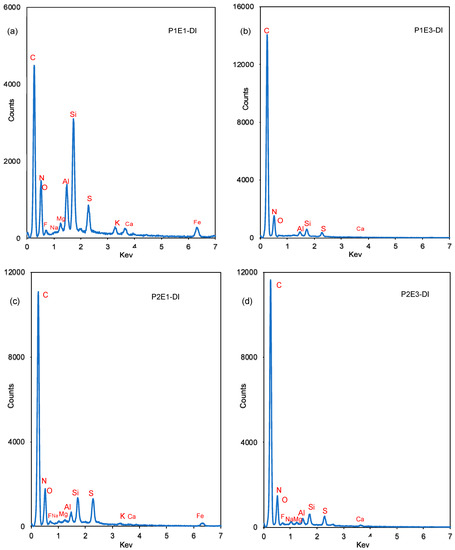 Energy dispersive X-ray microanalysis (EDX) of deionized water rinsed RO membranes. (a), Phase 1 Element 1, DI water rinsed (P1E1-DI); (b), Phase 1 Element 3, DI water rinsed (P1E3-DI); (c), Phase 2 Element 1, DI water rinsed (P2E1-DI); (d), Phase 2 Element 3, DI water rinsed (P2E3-DI).