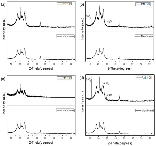 X-ray diffraction (XRD) of deionized water rinsed RO membranes. (a), Phase 1 Element 1, DI water rinsed (P1E1-DI); (b), Phase 1 Element 3, DI water rinsed (P1E3-DI); (c), Phase 2 Element 1, DI water rinsed (P2E1-DI); (d), Phase 2 Element 3, DI water rinsed (P2E3-DI).