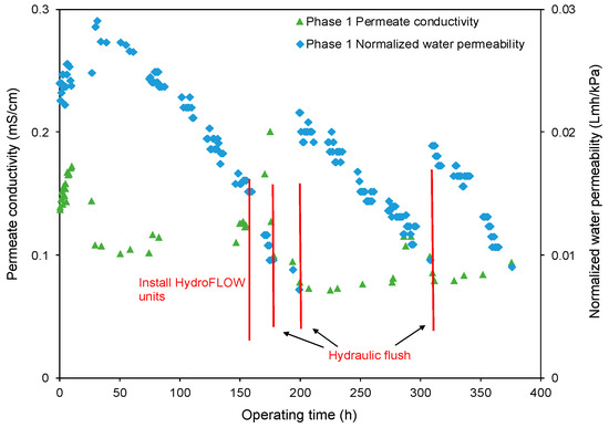 The impact of EMF on the RO membrane performance was also evaluated in terms of the solute transport between the feed and permeate streams. The permeate conductivity in P1 is presented in Figure 9. The permeate conductivity was approximately 0.10 mS/cm after the membranes reached equilibrium and before installation of the HydroFLOW units. After the installation of HydroFLOW units, there was an abrupt increase in permeate conductivity because of the descaling of the colloidal particles, fouling and scaling layer in the system and the high-water recovery caused by the clogging of the feedwater flow channels in the RO elements, as discussed in Section 3.1 and Section 3.2. After two hydraulic flushes to recover the RO membrane performance, permeate conductivity decreased to approximately 0.07 mS/cm. Figure 9 shows the permeate conductivity remained relatively stable for about 80 h, then started to increase after the NWP decreased to a certain level (0.016 Lmh/kPa and 0.014 Lmh/kPa without and with HydroFLOW units, respectively), indicating the declined RO membrane performance.