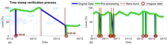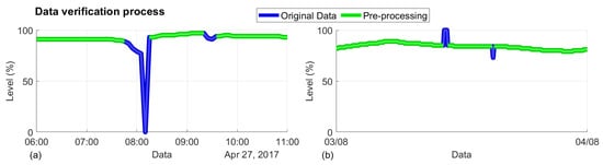 Particular cases of the signal pre-processing step: (a) Shows an impossible fall in the level. An operator remembers this case. It was caused by him touching the sensor accidentally. Minutes later he re-positioned the sensor, and approximately 1 h later, a technician re-calibrated the sensor. (b) Shows an unusual behavior of the sensor, which spontaneously read incorrect measurements of the level.