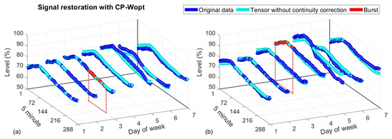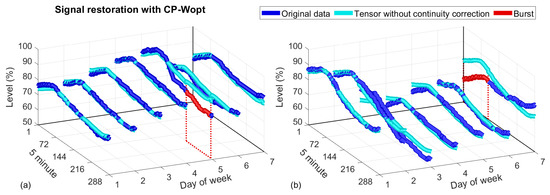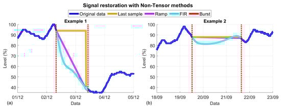 Various conclusions can be drawn from the results. In the general case of very short bursts, when , all methods make similar errors. Using a rough, less precise imputation method in the first stage usually works best with very low-range decompositions. This means that for the last sample method, the best performance is obtained using the most elementary tensor decompositions TK(1,1,1) and CP(1). However, the last sample method degenerates very quickly if the burst is larger than 25 samples. If the imputation method is more sophisticated, a bigger-rank decomposition improves the performance of the algorithm. We found the CP(6) (CANDECOM/PARAFAC) and Tucker(3,3,1) to be good options in all cases. The two decompositions work very similarly, although the latter may be slightly superior. Concerning the optimal size of the tensor, we explored the third dimension, which corresponds to weekly measurement, so that for the same removed burst, the tensor with known data was increased. We first ran the algorithms with three weeks of data and then proceeded to progressively add weeks to evaluate if the recovery improved with additional known data. The results showed an improvement in the performance until approximately seven weeks, when the performance results stabilized. When comparing the different algorithms with lost bursts of different lengths, it is apparent that for burst sizes of up to N = 100 samples, the results obtained with the ramp method are as good as those obtained using predictors, and it would only be justified to use a more complex method when N is (approximately) greater than 100. Furthermore, in all the experiments where algorithms were compared, we introduced the original CP-Wopt completion method and a modification of it in which the offset is corrected in the same way as that performed for the rest of the proposed algorithms. Finally, we note that in all cases, the simple offset correction step plays a fundamental role in improving the performance. We illustrated that the offset correction works by looking at examples of a couple of particular cases. The different steps of the proposed method are represented in Figure 15 and Figure 16. i.e., to allow a comparison to be made, the results of the algorithm of value imputation, the reconstruction of the signal through a low-range tensor, and the value of the reconstruction after correcting the offset, are visualized together with the data of the original burst that were erased at the beginning of the experiment.
