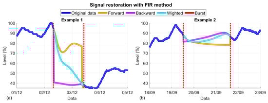 Particular cases of signal restoration with the FIR method: (a) shows a middle-length burst and (b) shows a large-length burst. In both cases, the forward and the backward FIR methods do not maintain the continuity of the signal but the Weighted FIR method does maintain such continuity.