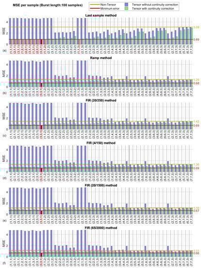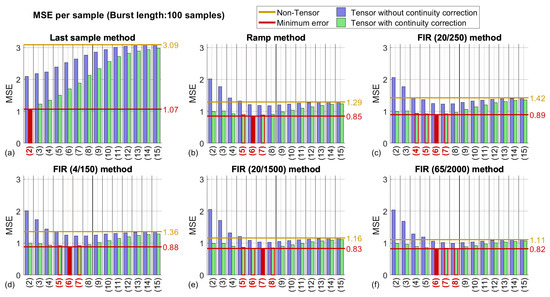 The algorithms used to perform the initial imputation of values were evaluated by means of the last value, the ramp, and certain different configurations of the FIR methods, followed by tensorization and corresponding Tucker decomposition of different sizes. For each case, the effect of applying or not applying the offset correction was considered. For reference purposes, the results were compared with (1) the value imputation method used directly without performing the tensorization step and (2) with the original CP-Wopt method and its modified version with the offset correction. The results are summarized using bar graphs in Figure 10. In this figure, the bar diagrams are segregated into subfigures according to the method of imputation used. In the axis of abscissas, the decomposition used is shown in parenthesis. When the imputation method used was the FIR, the method is referenced in the graphs as FIR (L,M), with the first number being the length of the filter and the second being the number of values used to calculate the auto-correlation coefficients. For each case, the bar of the decomposition with the minimum MSE per sample is marked in red (as well as certain other bars with similarly low values of MSE). In addition, a red horizontal line marks the specific value that is taken as a reference for comparison with the others. In order to achieve statistically representative results, the MSE values are the result of averaging 1000 experiments. Note that all tested methods performed their best with the Tucker(3,3,1) decomposition.