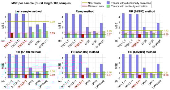 Note that each algorithm is presented with and without an offset correction. As explained previously, for each method, the sample that produces the lowest MSE is marked in red, and a horizontal line is plotted at this level to facilitate comparisons. It can be seen that once again, for all the methods shown, the decomposition Tucker(3,3,1) obtains the best results (see Figure 10 and Figure 12), except for the last sample value imputation method. Nevertheless, the remaining decompositions also achieve very similar results in a systematic way.