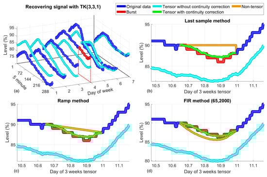 An example of the restoration stages. The tensor contains three weeks worth of data (288,7,3). The burst is 100 samples long, and its position is randomly selected: (a) shows the week of the tensor where the burst is located, , corresponding to week 3. Parts (b–d) show the three steps of the restoration process for the last sample, the ramp, and the FIR methods, respectively.