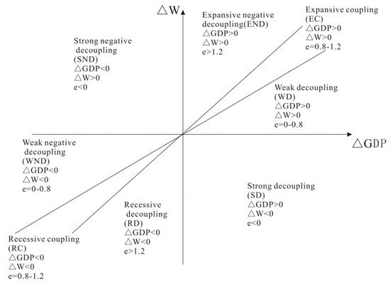 The decoupling elasticity index can be obtained through Equation (5) [9], the degree of coupling and decoupling of water consumption from economic development can be distinguished from Figure 1, and the meaning of each decoupling status can refer to Table 1: