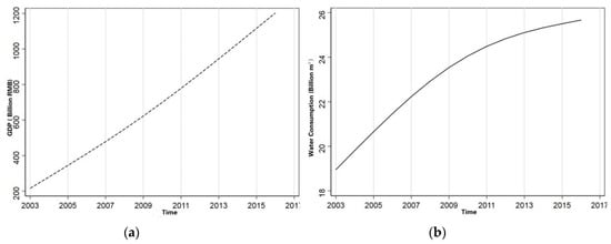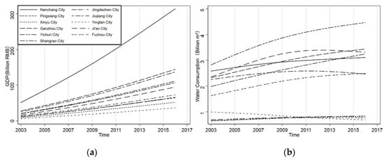 Figure 3 and Figure 4 show the variation in trend items of water consumption and GDP time series data in each city of the Poyang Lake basin and in Jiangxi Province by using the Hodrick–Prescott filtering method introduced in Section 2.1. As illustrated in Figure 3a, the extracted trend term of GDP showed an increasing trend. During the period of 2003 to 2016, Nanchang City had the fastest economic growth rate: the GDP increased by 508.8%, changing from 51.6 billion to 314 billion RMB (Ren Min Bi, China Yuan). However, Yingtan City had the slowest economic growth rate: the GDP only increased by 456.1%, changing from 6.6 billion to 36.7 billion RMB.