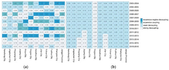 The decoupling results obtained from raw water consumption and GDP time series data (a) and from extracted trend components of water consumption and GDP time series data (b) in each city of Jiangxi Province in the Poyang Lake basin. The numbers in the boxes represent the decoupling elasticity index. The smaller the numerical value is, the better the decoupling status was and vice versa.