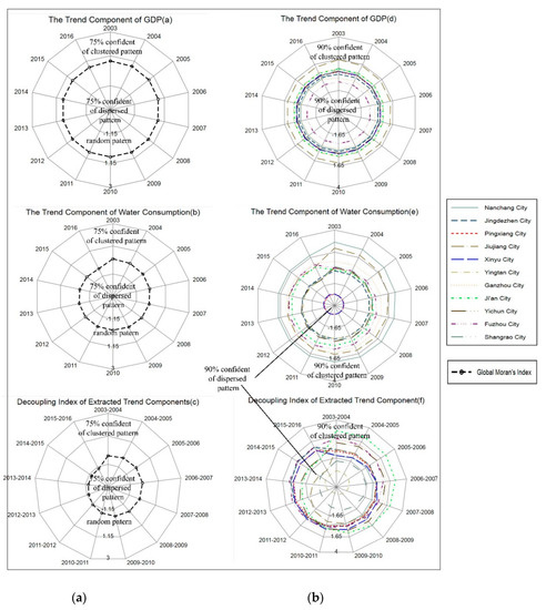 Figure 5a shows the average trends of extracted trends of GDP and water consumption by weighting the number of inhabitants and users of water, respectively. In Figure 5a, Nanchang City owned the maximum per capita GDP, while Shangrao City had the minimum per capita GDP. The per capita GDP of the all cities in Poyang Lake basin showed an increasing trend over the period 2003-2017. As illustrated in Figure 5b, the per capita water consumption of Yingtan City had the fastest decreasing rate, changing from 935.5 m3 in 2003 to 596.5 m3 in 2016. The per capita water consumption of Yichun City, Fuzhou City, Shangrao City, and Ganzhou City displayed an increasing trend. The per capita water consumption of Ji’an City, Nanchang City, Jiujiang City, and Pingxiang City showed an increasing trend at first and then slightly declined. Xinyu City displayed an increasing trend between the period of 2003 and 2011 and maitained basically at the value of 700 m3 after 2011.