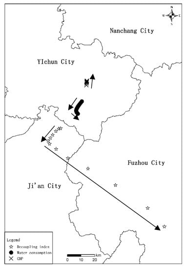 The gravity center could be regarded as the point where the maximum value of the regional feature lay, according to the definition. Therefore, the GDP gravity center was the point where the maximum economic output value occurred, as well as the same meaning of water consumption gravity center and the decoupling index center. A high decoupling index reflected that the water consumption rate was faster than GDP growth. To some extent, a high decoupling index presented a pattern of relatively low water utilization efficiency. Therefore, the migration of the decoupling index gravity center exhibited a variation in low water utilization efficiency. As illustrated in Figure 5, the migration direction of the GDP gravity center was opposite to the migration direction of the water consumption gravity center, which meant it was not necessary to consume much more water to promote economic growth for the region with the largest economic output value. This is basically in consistent with the result that the Poyang Lake basin is in a decoupling status at present. As illustrated in Figure 5, the migration direction of the water consumption gravity center was similar to the migration direction of the decoupling index gravity center, which meant that the region of low water resource utilization efficiency and the region of the largest economic output value were at different locations. Therefore, it can be inferred that the water resource utilization efficiency was relatively high and the water use pattern was sustainable to a certain extent.