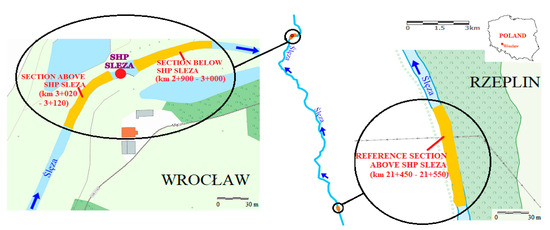 Our research was carried out in field conditions. Three 100 m-long sections on the river Ślęza were selected—the first, reference section was selected 18.5 km upstream the barrage (near Rzeplin, a small village in the commune of Żórawina), the second one above the hydroelectric buildings (Small Hydropower Plant—SHP) in Wrocław and the third one below the SHP. The research sections are located as follows: The reference section—km 21 + 450–21 + 550 of the river Ślęza, the section upstream the hydropower plant—km 3 + 020–3 + 120, the section downstream the hydropower plant—km 2 + 900–3 + 000.