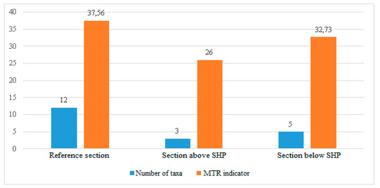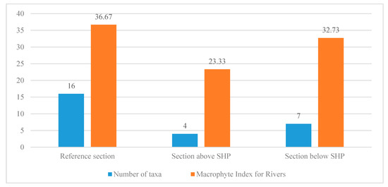 From the calculated Macrophyte River Index formula, after a field survey and comparison of individual plant species with the key, the value of MIR was obtained (complementary information on the basic hydromorphological conditions was also obtained, which can be found in Table 5), which is as follows: For the reference section—36.67, for the section above the barrage on the Ślęza—23.33, for the section below the barrage on the Ślęza—32.73 (Table 6, Table 7 and Table 8, Figure 2). Consequently, ES of these sections can be classified as good, poor and moderate, respectively. At this stage one may conclude that hydroelectric buildings contributed to the improvement of living conditions of macrophytes and to the appearance of species with higher environmental requirements and, consequently, less ecological tolerance. However, it should be added that the ecological condition on the section below the SHP is still worse than at the reference point, which is quasi-natural at this section of the Ślęza. This is most probably caused by the visible influence of the city of Wrocław—i.e., the discharges of waste water, the runoff of fuels from the nearby transportation routes or the waste thrown away to water. Moreover, the number of taxa and the worsening of their quality is also caused by the surfaces being more tight—strengthened near the bridges and hydrotechnical structures or profiled at some sections of the watercourse [35,36,37]. Details on the identified macrophyte taxa and their occurrence in a given type of habitat (and, consequently, information on the pollution of water environment) are given further on in this chapter.
