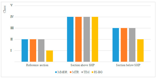 The last method in our comparison is the Bulgarian Reference Index of Macrophytes (RI-BG), which is based on the assessment of taxa in three reference groups, depending on the river type. In this case the macrophytes are divided into group A (reference species in a given river type—reference taxa), group B (the so-called indifferent taxa) and group C (the taxa which cause degradation and do not occur in natural conditions in this type of river—degradation indicators). One can distinguish three main groups of rivers used for assessment in this method (R-G1, R-G2, R-G3). In each of these groups, different macrophyte indicator species are distinguished. The description of types of river groups is given in Table 2. The assessment is carried out on 100 m-long watercourse sections, in which the abundance of macrophyte taxa that occur in it (macrophyte abundance—MA) is assessed based on a 5-class Kohler’s scale [32] given in Table 3. Additionally, in this method the quantity (Q) of taxa from a group is determined: This value equals the cubic power of macrophyte volume (Q = MA3). The method also accounts for the structural characteristic of the watercourse channel, flow velocity, bed, shading, as well as the information on the colour and smell of water, if they diverge from standard [10,33,34].