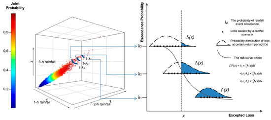 In this study, design rainfalls are derived from the joint probability distribution. Therefore, for certain joint probabilities, various design rainfalls can be generated. Assuming is the exceedance probability of a rainfall event, and is the probability distribution of loss under the condition of rainfall occurrence, the exceedance probability of loss can be estimated using the following formula: