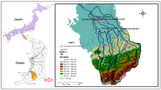 The study area is located in the southern part of Osaka Prefecture, Japan. The Otsu River, which originates in the Katsuragi Mountains and flows about 68 km westward to Osaka Bay, is a river within Osaka Prefecture that consists of five branches. The river basin extends from 34°20′ N to 34°30′ N and from 135°23′ E to 135°21′ E with an area of 102.2 km2, and it includes three cities. The average annual temperature in the study area is 16 °C, and the average annual rainfall is about 1200 mm. Rainfall data were derived from four rain gauging stations with 49 years of hourly rainfall records.