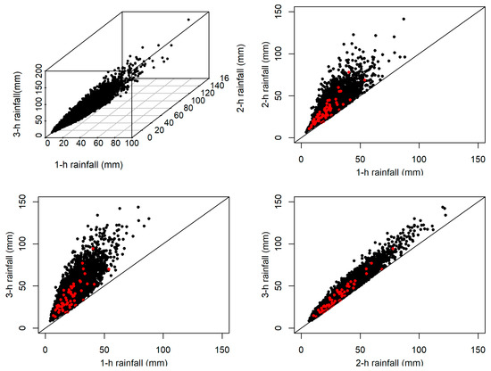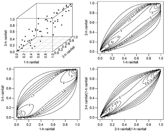 Although all rainfall data could be used to evaluate the dependence structure, flood risk analysis is more concerned with extreme rainfall events. Therefore, annual maximum rainfall events corresponding to 1 h, 2 h, and 3 h durations were selected. Data triplets were selected to analyze the correlations of the maximum 1 h, 2 h, and 3 h rainfall amounts in extreme rainfall events. For each year, using the annual maximum 1 h rainfall amount as a criterion, an extreme event is selected. Then, one triplet of (1 h, 2 h, 3 h) rainfall amount data is obtained. The same is done using the annual maximum 2 h or maximum 3 h rainfall amount as a criterion. Since we have 49 years’ worth of records, we have 49 × 3 = 147 triplets. However, many of the triplets overlap because annual maximum 1 h, 2 h, and 3 h rainfall amounts may occur during the same rainfall event, or two of them may occur during the same rainfall event. Removing repeated triplets resulted in 68 data triplets (1 h, 2 h, 3 h rainfall amounts), which were adopted for the trivariate copula analysis.