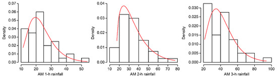 A major advantage of constructing copula-based joint distributions is that the copula structure and marginal distribution can be estimated independently. The 68 data triplets are used to estimate the copula structure. However, according to block extreme value theory, for each year, only one value for each 1 h, 2 h, and 3 h rainfall amount can be used. Therefore, three sets of 49 data points are used to estimate the marginal distribution. The AIC and KS tests indicate that among the set of candidate distributions mentioned in Section 2.2, for annual maximum 1 h rainfall, the best-fitting distribution is a lognormal distribution with parameter (3.098, 0.359); for annual maximum 2 h rainfall, the best-fitting distribution is Pearson 3 with parameter (1.76, 16.259, 10.725); and for annual maximum 3 h rainfall, the best-fitting distribution is lognormal with parameter (3.672, 0.369), as shown in Figure 6.