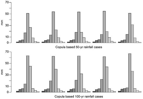 Five rainfall cases for 50-year and 100-year return periods from copula-based rainfall analysis. The y-axis is rainfall amount, the x-axis is rainfall duration; 9-h rainfall events are designed.