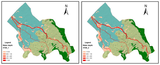 Using the design rainfall from the previous section as input, flood scenarios under different rainfall situations can be simulated. Figure 9 presents two examples of flood simulations under different rainfall scenarios but with the same return period. Based on this flood simulation, the spatial distribution of hazards can be understood. It is interesting to note that due to the joint probability analysis of rainfall, different rainfall scenarios can be generated, even under one joint probability; thus, inundation can be different, even for the same return period.