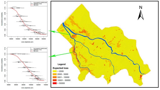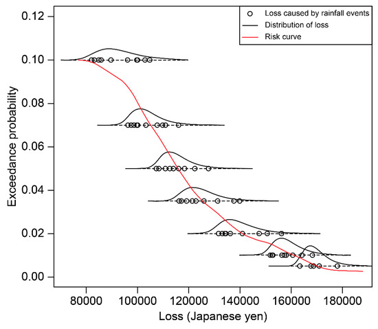 Loss can be calculated by combining hazard, exposure, and vulnerability. A risk curve can be estimated after calculating all rainfall events using Equation (3). Figure 10 shows an example of a risk curve for a single mesh cell. For each return period, expressed here as exceedance probability, several rainfall events are generated. As stated above, the rainfall events are simulated from the joint distribution of rainfall amounts of different critical durations, which represent the influence of different flooding sources on the risk assessment area. Therefore, the distribution of loss at a certain return period reveals the uncertainty of the combination of floods from different flooding sources. It is obvious that as many rainfall events as possible should be included to produce a better fit of the loss distribution for each return period. However, given the cost of flood simulation, only a limited number of rainfall events are chosen. This can be improved in future studies. The risk curve describes the exceedance probability distribution of loss. For example, in Figure 10, the exceedance probability of economic loss of 140,000 Japanese yen is about 0.02, which means, considering all the floods that may happen in this area, the probability of economic loss beyond 140,000 is about 0.02.