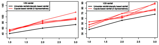 This study began with the problem of how to assess flood risk from multiple flood sources. However, with the assumption of spatially identical rainfall, it focused on the problem of the temporal correlation of design rainfall. Compared to design rainfall methods based on conventional intensity-duration-frequency (IDF) curves (e.g., the Chicago method), our approach has two advantages for solving the problem of flood risk assessment from multiple flood sources: (1) Critical rainfall durations are determined by the time of concentration of flooding from different flood sources that connect flood risk assessment with design rainfall. (2) Copula-based rainfall analysis considers the joint distribution of rainfall amounts with different critical durations, which enables the generation of different types of rainfalls rather than a deterministic type of rainfall for a certain return period. In addition, since copula-based design rainfall uses joint probability and IDF-curve-based design rainfall uses only marginal probability, according to the copula’s Frechet–Hoeffding bounds [30], given a return period, copula-based design rainfall will always be larger than IDF-curve-based design rainfall, as illustrated in Figure 12. With regard to this study, this phenomenon can also be interpreted such that flooding from multiple sources will always be more dangerous than flooding from only a single source. Hence, flood risk will be underestimated when conventional IDF-curve-based design rainfall is applied to consider flooding from multiple flood sources.