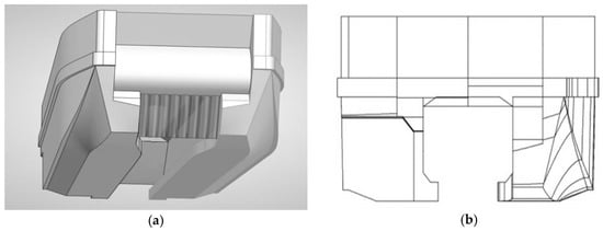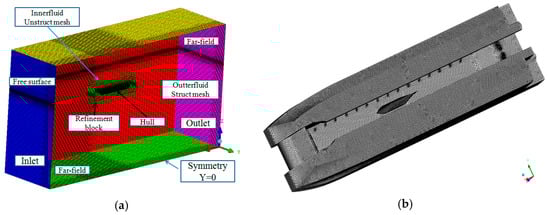 Calculating mesh. (a) Calculation domain setup and set boundary conditions; (b) Hull mesh.