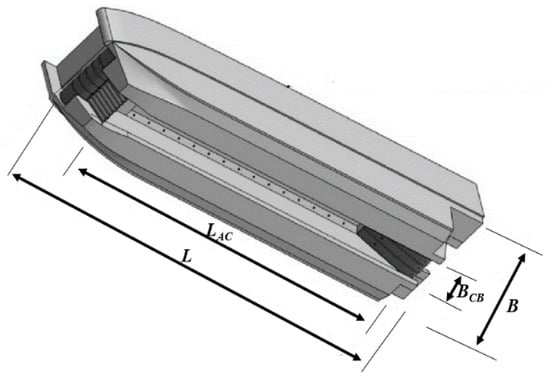 The main configuration and geometric features of the Partial Air Cushion Supported Catamaran Model is shown, while the transverse section profile line is also attached in Figure 1. The main parameters are shown in Figure 2 and Table 2. It can be observed that the main body of the ship is composed of two firm demihulls connected by a connection bridge structure. An air-pressure plenum chamber sits in the middle of the connection bridge bottom, and the air cushion chamber sits right below the connection bridge linked to the plenum chamber, which is bounded by rigid demihulls and flexible air seals at the bow and stern. The air cushion mainly exists in the air cushion chamber, where the movement of the hull, the effusive air flow at seal bottom, and plenum fan meet a dynamic balance. The dynamic procedure maintains stable cushion pressure.