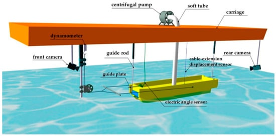 The PACSCAT model tank test was carried out in the China Special Vehicle Research Institute (also known as Aviation Industry of China NO. 605 subsidiary research institute) with the maximum length towing tank in China. The towing tank principal dimensions are: length 510 m, width 6.5 m, and depth 6.8 m. The corollary carriage towing system can reach a speed range of 0.1 m/s to 22 m/s, with a stable speed error under 0.1%. A schematic overview of the tank test is shown in Figure 3. The PACSCAT model is fixed to the carriage (with pitch and heave free). The arrangement of measuring device and sensors are as follows: