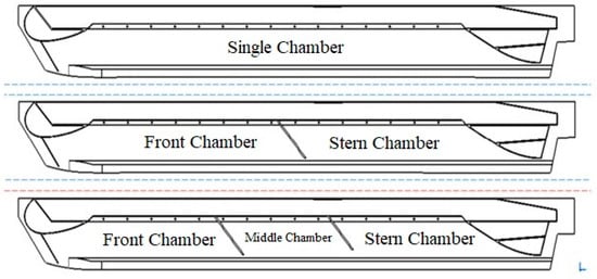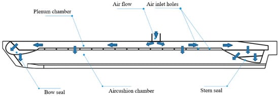 Air Cushion compartment is a key technology in the upsizing of air cushion ships, which provides sufficient longitudinal and transverse stability for large hovercraft []. Similarly, the uniform pressure distribution in the hover air chamber can also be significant to the longitudinal and transverse stability of the PACSCAT while the complete consistency air cushion pressure at the bow and stern may not have an entirely favorable effect on the air cushion’s navigational attitude. Eclectically, uniform distribution in the local region but with step-transmutation distribution, in general, a more favorable design criteria can be reached. Based on the air cushion compartment, regulating the pressure of each sub-cushions is also a means to improve the motion attitude.