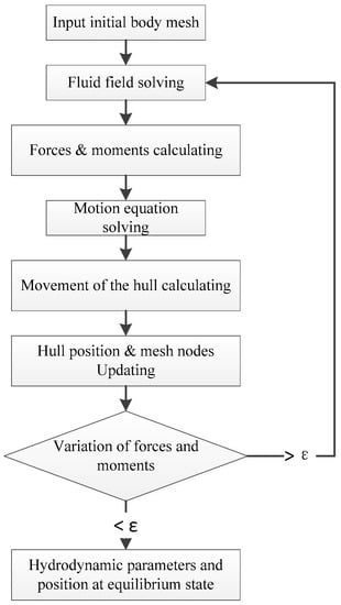 where , and are shear stress, pressure, and gravity, separately. While S is symbol for the surface of hull and the and for displacement of mesh nodes and gravity center. After that, the linear and angular motion parameters, obtained by solving Equations (1) and (2), are used to update the hull position. The same applies to the mesh nodes. Subsequently, a loop is carried out to solve the fluid field with the new mesh. This algorithm meets the termination criteria at the phase where the force and moment stabilize at a certain value. Figure 6 shows the solving procedure in detail.