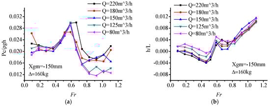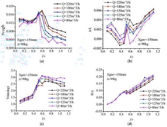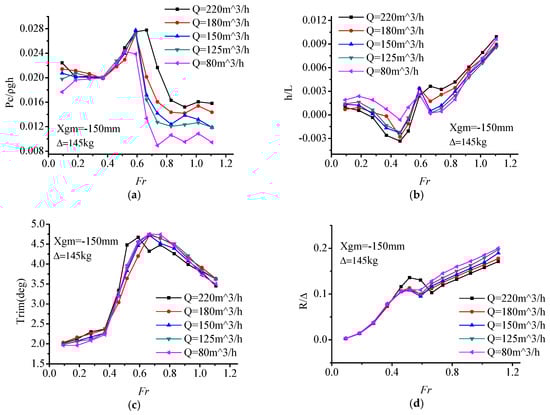 Main parameters dimensionless have been proceed under dimensionless expressions shown in Table 3. In Figure 8, Figure 9 and Figure 10, it can be seen that with the change of load displacement (90 kg, 145 kg, 160 kg), the variations of air cushion pressure Pc are consistent with each other. At light displacement 90 kg, with the increase of air flow, the air cushion pressure increased. Within the range of Fr = 0.59–0.66, the pressure curve reached its pressure peak, which was slightly later than the resistance peak (Fr = 0.46–0.66).