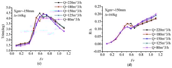 In another form, the experimental data are organized to clarify the comparison of the air cushion pressure, heave, trim, and resistance under various displacements at the same air flow rate, respectively (On account of five different air flow rate condition, the figures are summarized in five groups, and the number plot is up to 20. Considering a better continuity and readability of the main text, the plots are attached in Appendix A). From Figure A1, Figure A2, Figure A3, Figure A4 and Figure A5, it can be seen that the demihull draft increases with the displacement, so does the trend of air cushion pressure and trim angle. As for the total resistance, the displacement has a significant influence on total resistance peak value, with a positive correlation trend; the increase of displacement corresponds to the increase of the resistance peak while there is no obvious resistance difference at high speed.