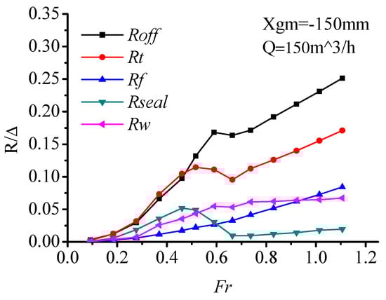 From Figure 13, total resistance comparison between Roff and Rt at the low-speed segment (Fr < 0.46), Roff is slightly less than Rt. The cause is that the bow seal submerged depth is great at the low-speed hover state, and the impact of decreased hull wetted area cannot cover the friction resistance and wave-making resistance produced by bow air seal. Similarly, the total seal resistance has an increasing trend because of the heave and trim making seal submerged depth increase. At the Froude number of 0.46, the seal immersed maximally, the total seal resistance reached the top until the Froude number of 0.66 where the seal reached the free surface gradually, the total seal resistance decreased to a negligible level. The frictional resistance was similar to that of the displacement ship which increased monotonically with the increase of speed. At low speed, the proportion of friction resistance was small, but with a major proportion at high speed. The wave-making resistance takes a large proportion of total resistance in the full-speed range. And specifically, it is the maximum component at resistance hump, and getting to a stability range after that.