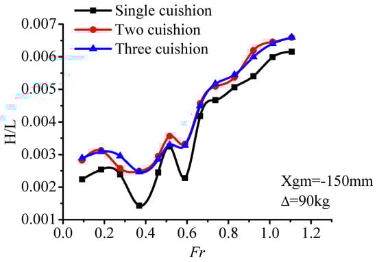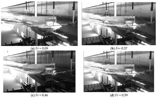 In this paper, data dimensionless processing was carried out as: dimensionless air cushion pressure (), the drag-to-weight ratio (), and dimensionless sinkage (h/L). All these parameters versus the volume Froude number are summarized with figures. In the following Section 3.2 and Section 3.3, further experimental phenomena and results analysis will be discussed.