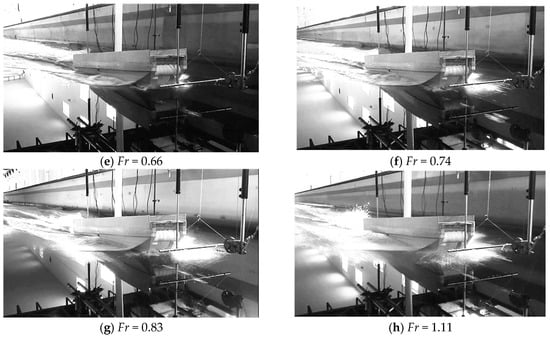 Through data processing, it is worth noting that the test phenomena and resistance characteristic vary with the speed and have strong regularity and have basically the same trend under various working conditions. Taking condition = 145 kg, Q = 150 m3/h as a representative sample is feasible. Decomposing the resistance, every component force and its ratio are obtained within the range of speed. Some of the components (e.g., air resistant) have a very small ratio and are omitted. Figure 12 shows a diagram of the forces ratio situation. And Figure 13 shows a series of wave snapshots of bow view at different speeds.