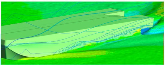 To evaluate the results of the numerical simulation method, comparisons between the wave phenomenon of numerical simulation and experimental results were carried out. So were the numerical simulation and experimental parameter values. The numerical method showed an accurate simulation of these characteristics with better anastomosis. Taking conditions Fr = 0.31and Fr = 1.03 as examples, details are shown in Figure 14 and Figure 15. At the Froude number of 0.31, the gravity center and the trim angle were both a small value. Bow seal generated a water-pushing effect and wave at midship side reached a certain height. At the Froude number of 1.03, no significant bow appeared, and the wave peak moved to the stern. A larger wake flow crests formed at the longitudinal mid-section which were all reflected in numerical simulation. In experiment, there were some thin non-airtight slit on the seals and a slit may also exit at the junction with the hull while in the numerical situation, all these junction and slit could be ignored, only demihull side leaks air flow as shown in Figure 16. Therefore, high-speed airflow can leak from the slits which may cause the wave-making, especially wave-making behind the hull, to be more obvious than the simulating condition. Figure 14 and Figure 15 reflect the phenomenon. It is also a reason explaining why the experimental resistance is higher than the numerical result.