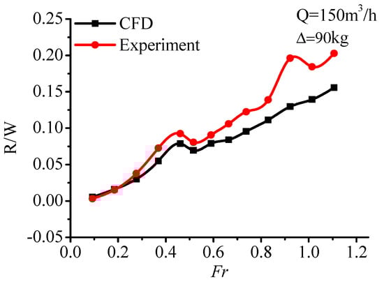Resistance curves of CFD and experiment (Δ = 90 kg, Xgm = 150 mm, Q = 150 m3/h).