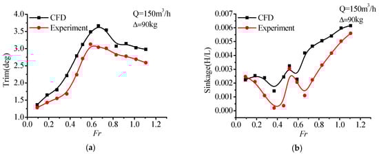 Motion attitude curves of CFD and experiment: (a) Trim angles curves; (b) Sinkage curves (Δ = 90 kg, Xgm = 150 mm, Q = 150 m3/h).