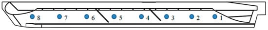 To measure the pressure distribution in the air hover chamber globally, the pressure monitoring points were added during the numerical simulation process, as shown in Figure 20. The monitoring points were arranged equidistantly from 1 to 8 along the air chamber. For the model-3, monitoring points 1 to 3 were located in the rear air chamber, monitoring points 4 and 5 were located in the middle chamber, and the rest 6 to 8 were located in the front.