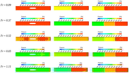 In model-1, the pressure distributed uniformly in the hover air chamber. The range of pressure difference was not more than 30 Pa except for the low-pressure area around the intakes where the air is injected into the cushion which also proves the obvious pressure stabilizing effect of the plenum chamber. In addition, the pressure in the air cushion chamber fell at first and then increased to a peak with increasing speed (which Fr ranged from 0.37 to 0.52). Finally, it decreased to a smaller value. Simultaneously, the front chamber of model-2 and front and middle chambers of model-3 also showed similar pressure transformations. It shows there is a good agreement of the trend of pressure changing phenomenon and regularity between the simulation and testing data. And more details on self-comparison pressure distribution is analyzed in Section 3.2.