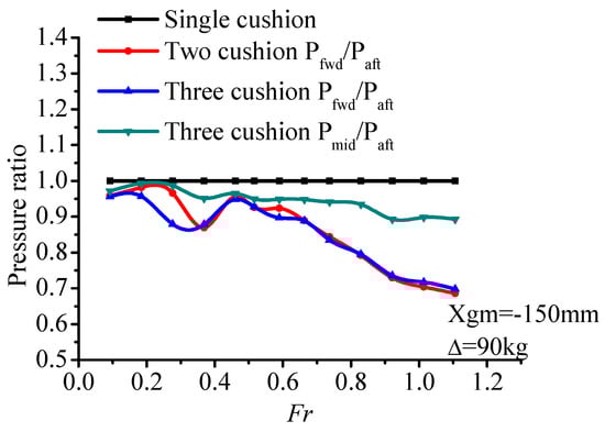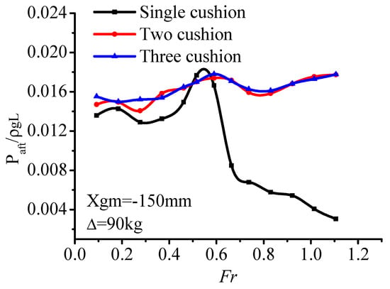 Figure 22 shows the dimensionless pressure value measured at point 1 of model-3 with increasing speed. It can be clearly seen that the absolute pressure value of the stern chamber is higher than that of the single cushion. Either the model-2 or model-2 does so which indicates that the air cushion compartment has a better effect on increasing the stern pressure. Especially during the high-speed segment, the pressure of the stern chamber of model-2 or model-2 is maintained at a high level, which provides favorable conditions for increasing the air pressure ratio between the front and stern chambers.
