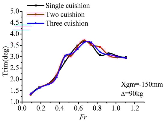 Within the range of the whole-speed segment, interaction of the air cushion pressure, and hydrodynamic force act on the model. Air cushion pressure had a small influence on the trim angle, but a great relationship with the heave. In the low-speed segment (Fr < 0.46), with the increase of speed, the air cushion pressure was stable within a certain range while the trim angle increased, thereupon, the center of gravity position decreased, and the value of heave went down. In this speed segment, the hull met the characteristics of conventional displacement ship, and the resistance increased sharply.
