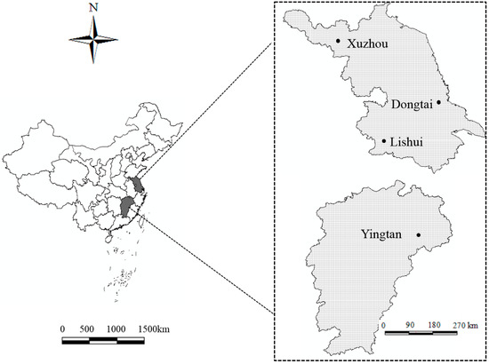 Experimental soils were collected from four regions: yellow brown soil (117°26′42″ E, 34°10′04″ N) and fluvo-aquic soil (116°29′43″ E, 34°43′37″ N) from Xuzhou, Jiangsu Province, China; brown soil (119°43′39″ E, 31°33′31″ N) from Lishui District, Nanjing, China; saline soil (120°33′42″ E, 32°45′58″ N) from Dongtai, Jiangsu Province, China; and red clay (116°58′42″ E, 28°28′06″ N) and red sandstone soil (116°52′26″ E, 28°07′33″ N) from Yingtan, Jiangxi Province, China (Figure 2). We collected 80 kg samples of each soil type from the surface layer (0–20 cm), and the basic soil physical and chemical properties, including soil pH, soil organic matter, soil bulk density, SWC, and soil texture, were measured according to [37]. Soil pH was measured in a 1:2.5 (w/v) ratio of soil to distilled water. Soil organic matter was determined using a KCr2O7-H2SO4 oil bath. SWC was measured by the gravimetric method, and soil bulk density was determined using the ring knives method. Soil texture was determined using a pipette and sieve analysis (Table 1). According to the USDA classification system, soil particles can be divided into three particle fractions based on size: clay (<0.002 mm), silt (0.002–0.05 mm), and sand (0.05–2.0 mm); except for the red clay and red sandstone soil, which are composed of clay and loamy sand, respectively, the soil textures of the soil types are silty loam. The tested soils were all naturally air-dried and sieved by a 2–7 mm mesh.