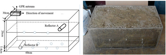 A 10-mesh nylon was placed on the bottom of the box, and the soil was homogenously backfilled into the box to reach the field-measured soil compaction. The thickness of the soil in the box was the same as the depth of the model box. To accurately extract the electromagnetic wave spectrum characteristics and the thickness of the reflected layer, reflectors A and B, each of which was 5.4 cm in diameter and 10 cm long, were buried at two positions in the model box. Reflector B was located on the bottom along the center axis, 15 cm from the left wall of the box. Reflector A was located 15 cm from the right wall of the box, and its top was 10 cm from the soil surface (Figure 3).