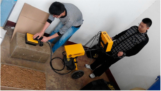 The GPR data acquisition system used in this study is the Seeker SPR GPR system, which is produced by US Radar and British ERA, and the process was performed using a shielded antenna with a frequency of 2 GHz. The GPR acquisition parameters are shown in Table 2. The interval of 0.005 m indicates that radar wave information is collected every 0.005 m, and the time window of 13 ns means that the time set on the longitudinal section is 13 ns, which determines the depth of detection. Depth indicates the maximum data acquisition depth of 0.4 m. The GPR’s shielded antenna was moved slowly along the soil surface of the model box, and the system automatically recorded and stored the data, repeating each probe three times (Figure 4).